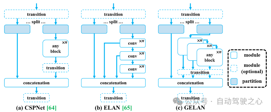 如下图所示,(a) CSPNet ,(b) ELAN,以及 (c) YOLOv9提出的GELAN。模仿了CSPNet,并将ELAN扩展为GELAN,可以支持任何计算块。