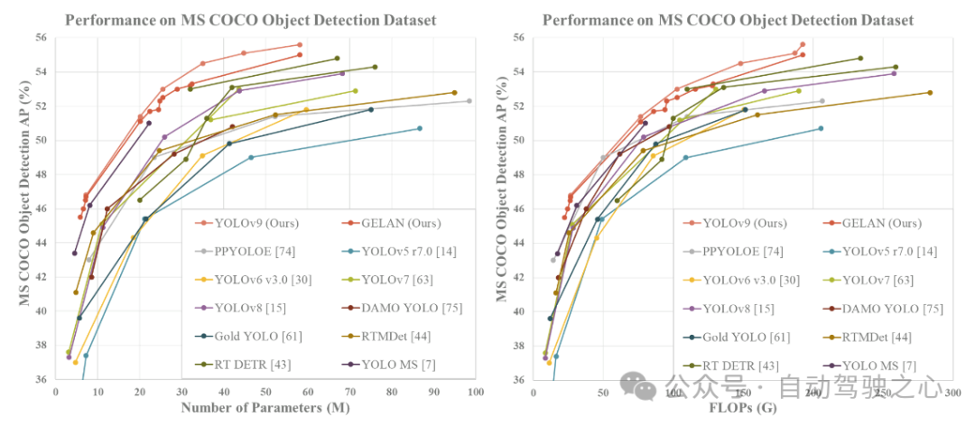 GELAN的架构证实了在轻量级模型上使用PGI取得了优越的结果。在MS COCO数据集上对所提出的GELAN和PGI进行了验证,结果显示GELAN仅使用传统卷积算子就能实现比基于深度卷积的最先进方法更好的参数利用率。PGI可以用于各种模型,从轻量级到大型模型都可以。它可以用于获取完整的信息,使得从头开始训练的模型可以比使用大型数据集预训练的最先进模型取得更好的结果。