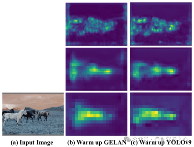 GELAN和YOLOv9(GELAN + PGI)的PAN特征图(可视化结果):在进行一轮偏置预热后。GELAN最初存在一些分歧,但在添加了PGI的可逆分支后,它更能够集中注意力于目标对象。