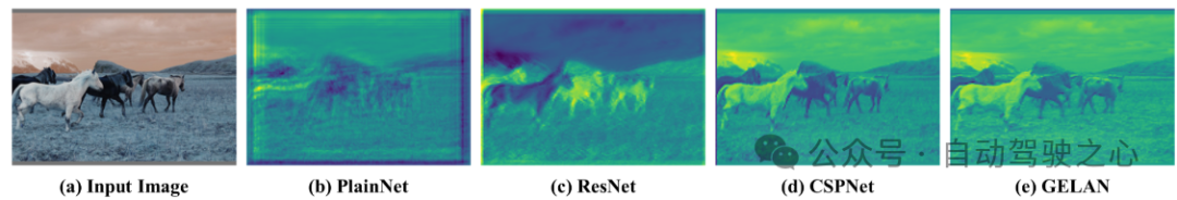 不同网络架构的随机初始权重输出特征图的可视化结果: (a)输入图像,(b)PlainNet,(c)ResNet,(d)CSPNet 和(e)提出的 GELAN。从图中可以看出,在不同的架构中,提供给目标函数计算损失的信息程度不同,而我们的架构可以保留最完整的信息,并为计算目标函数提供最可靠的梯度信息。