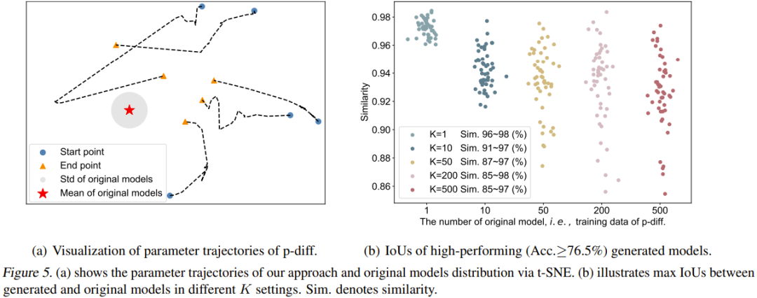 该团队也可视化了 p-diff 过程的轨迹。具体而言,他们绘出了在推理阶段的不同时间步骤生成的参数轨迹。图 5(a) 给出了 5 条轨迹(使用了 5 种不同的随机噪声初始化)。图中红心是原始模型的平均参数,灰色区域是其标准差(std)。