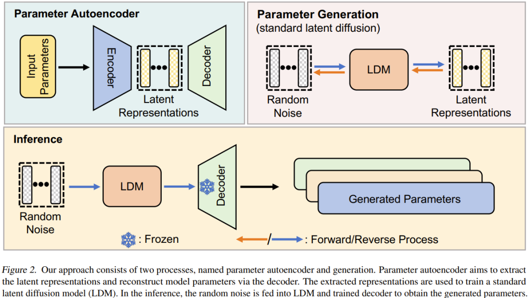 该方法的思路很直接,就是使用标准的隐扩散模型来合成神经网络的参数集,因为扩散模型能够将给定的随机分布转换为一个特定的分布。