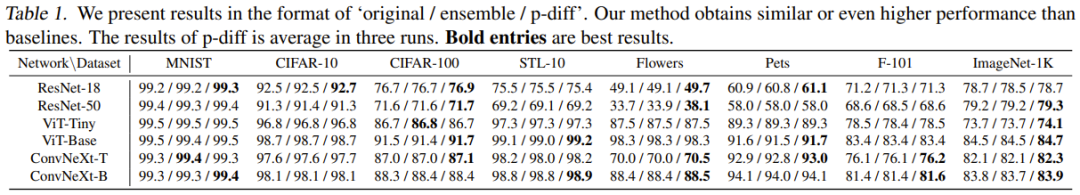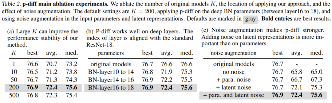 为了研究 p-diff 在其它归一化层深度上的有效性,该团队还探索了新方法合成其它浅层参数的性能。为了保证 BN 参数的数量相等,该团队为三组 BN 层(它们位于不同深度的层之间)实现了新提出的方法。实验结果见表 2(b),可以看到在所有深度的 BN 层设置上,新方法的表现(最佳准确度)都优于原始模型。