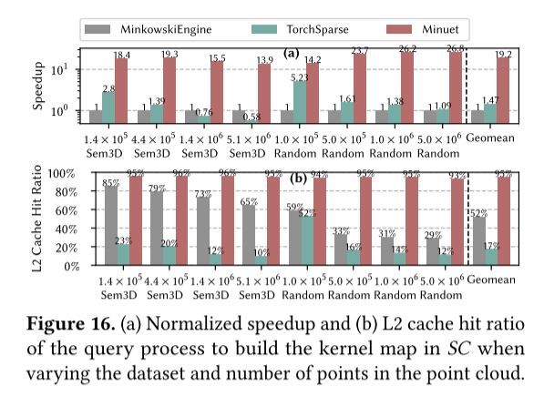 本文提出的 SC 算法可以实现与基于哈希表的搜索类似的理论计算复杂度(第 5.1.3 节),并提供显着更高的内存效率,提高 GPU on-chip caches 的命中率(图 16b)。在GMaS执行步骤中,Minuet提供了两种优化。首先,本文在每次 Gather 和 Scatter 操作中即时调整用于处理多个输入/输出特征通道的 tile 大小。这项关键技术使 Minuet 能够使 SC 执行适应点云网络、真实数据集和 GPU 架构中每个 SC 层的特定特征,从而在 Gather 和 Scatter 操作中提供高系统性能。其次,Minuet 集成了一种填充高效的 GEMM 聚合策略,该策略首先根据输入/输出特征向量的大小对 GEMM 操作进行重新排序,然后将 GEMM 操作聚合到批量的 GEMM 内核启动中。通过这种方式,Minuet 可以优化 (i) 零值填充量,从而最大限度地减少对 GEMM 内核中无用数据的不必要的数据访问和计算,以及 (ii) GEMM 内核启动(kernel launch) 开销。