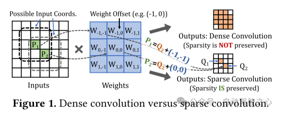 图 1. 密集卷积与稀疏卷积。