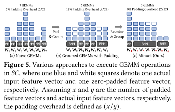 图 5. 在 SC 中执行 GEMM 操作的各种方法,其中一个蓝色和白色方块分别表示一个实际输入特征向量和一个零填充特征向量。假设 ?? 和?? 分别是填充特征向量和实际输入特征向量的数量,则填充开销定义为(??/??)。