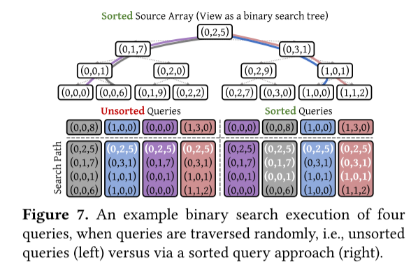 图 7. 随机遍历查询时执行四个查询的二分搜索示例(即未排序查询(左)与排序查询方法(右))。
