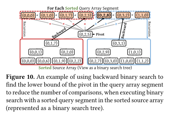 图 10. 当对已排序源数组中的排序查询段执行二分搜索时(表示为二叉搜索树 ),使用反向二分搜索查找查询数组段中 pivot 的下界以减少比较次数的示例。