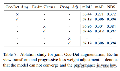 在表7中展示了联合Occ-Det空间增强、Ex-Im视图转换模块和渐进loss weight调整策略的有效性。通过所提出的空间增强和所提出的视图变换模块,它在mIoU、mAP和NDS度量上显示了检测任务和占用任务的显著改进。loss weight调整策略能够有效地训练多任务框架。如果没有这一点,统一框架的训练就无法收敛,性能也很低。