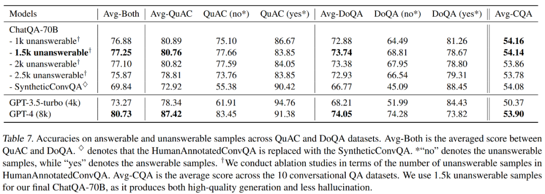 表 7 展示了本文模型与 OpenAI 模型在 QuAC 和 DoQA 数据集上进行了比较。