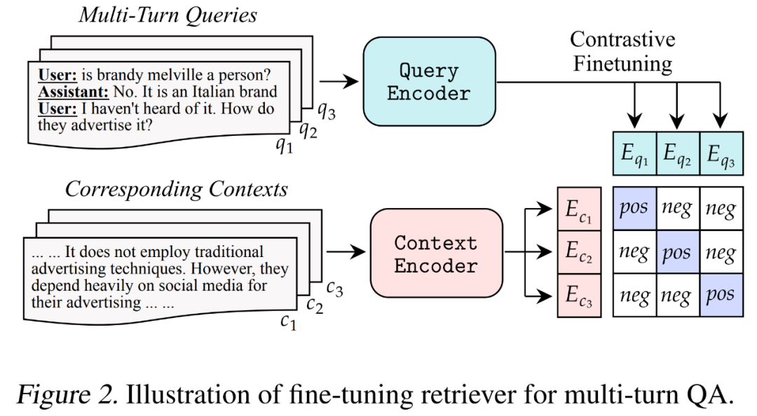 在图 2 中,研究者描述了他们的检索器微调方法,以缓解这一问题。他们建议使用对话查询和上下文对来进一步微调单轮检索器,以更好地应对对话输入。