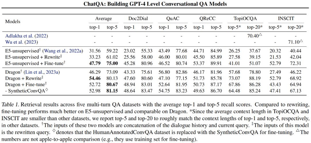 为了增加文档长度的多样性,研究者还收集了五个包含短文档(少于 1500 字)的对话式问答数据集。平均而言,每个单词将被分解为 1.5K 个 tokens。这些数据集包括 CoQA、DoQA、ConvFinQA、SQA 和 HybridDial。