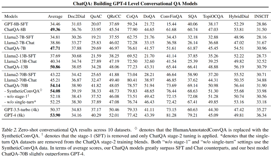 如表 2 所示,研究者比较了不同的模型变体和 OpenAI 模型在 10 个对话式问答数据集上的表现。