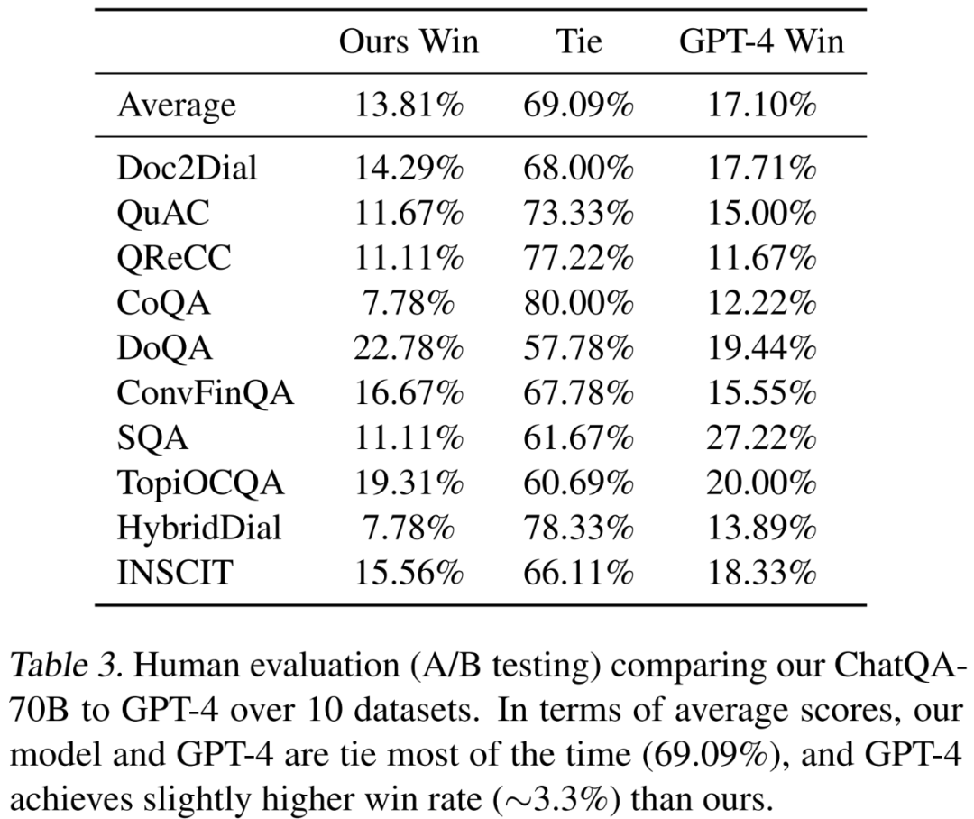 10 个数据集的人类评估结果如表 3 所示。首先,在大多数情况下(占比 69.09%),ChatQA-70B 模型和 GPT-4 表现相当。而 GPT-4 在胜率上略高于本文模型,大约高出 3.3%。这进一步证明了其模型在提供正确答案方面具有强大的能力。其次,在 ConvFinQA 任务中,本文模型比 GPT-4 有略微更好的胜率,这显示了该模型在算术计算方面的强大能力。第三,GPT-4 在 SQA 任务上的胜率明显更高,这表明在表格推理任务上,本文模型与 GPT-4 之间仍存在一定差距。