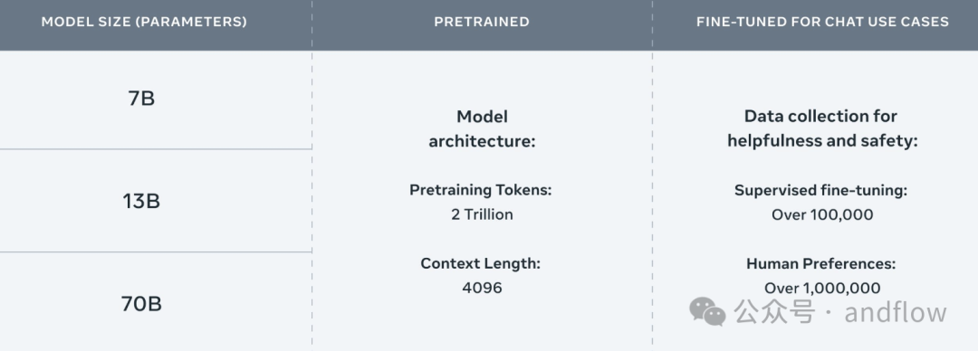 Llama 2是Meta于2023年推出的最重要的开源LLM。这是一个在2万亿令牌上训练的预训练生成AI模型,支持70亿到700亿个参数。Llama 2比Llama 1多了40%的训练数据,并且支持的上下文长度多了两倍。