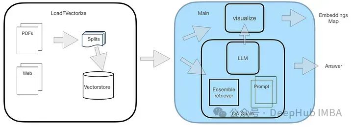 LoadFVectorize模块加载pdf或web文档。对于最初的测试和可视化。第二个模块加载LLM并实例化FAISS检索,然后创建包含LLM、检索器和自定义查询提示的检索链。最后我们对它的向量空间进行可视化。