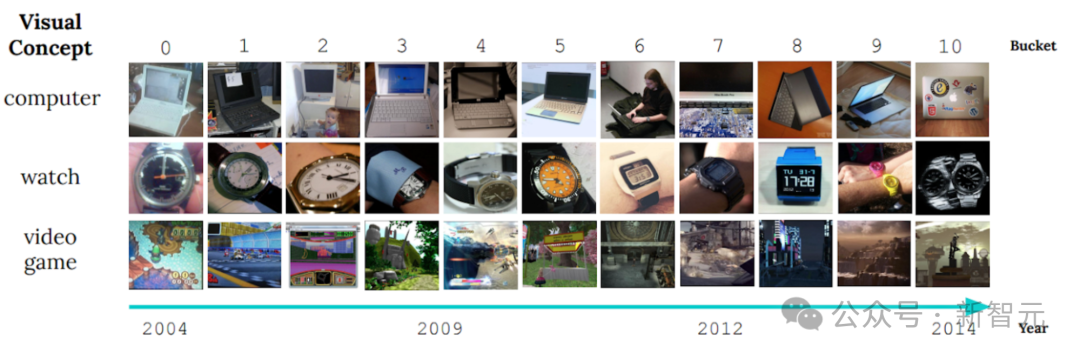 一个显著的例子是CLEAR非稳态学习基准的图像展示,它揭示了物体视觉特征在十年间发生的显著变化。