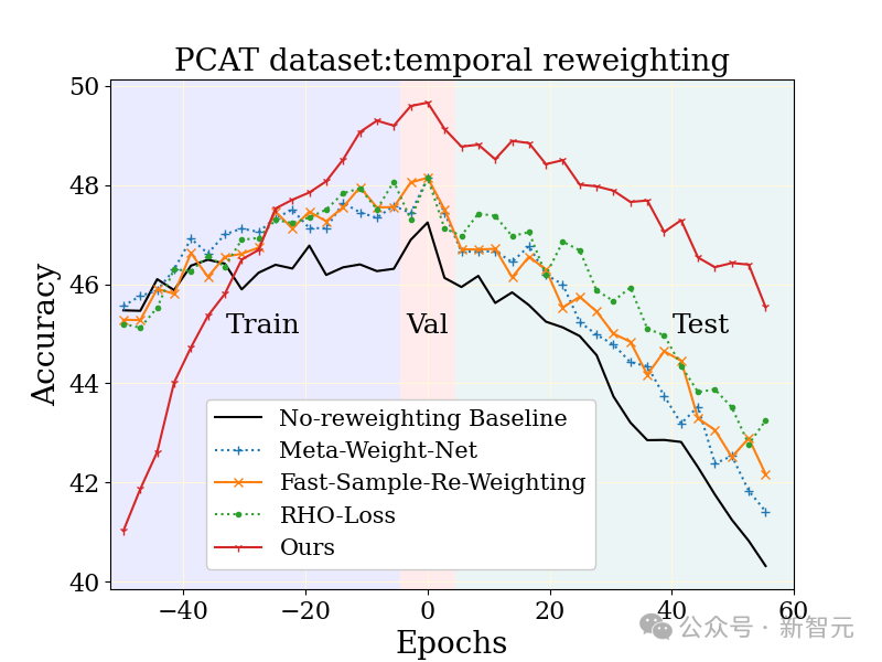 值得注意的是,MUSCATEL方法有意识地调整了对遥远过去数据的准确性,以换取测试期间性能的显著提升。这一策略不仅优化了模型对于未来数据的适应能力,同时还在测试期间表现出较低的退化程度。