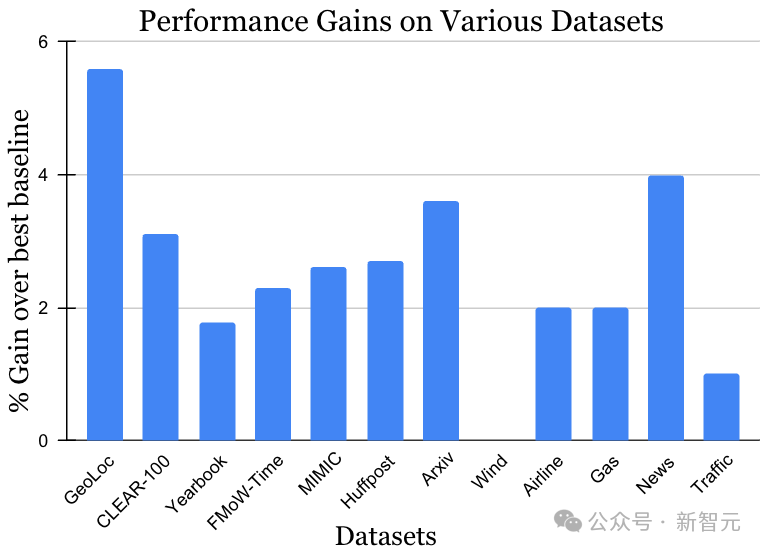 非稳态学习挑战的数据集涵盖了多种数据来源和模式,包括照片、卫星图像、社交媒体文本、医疗记录、传感器读数和表格数据,数据规模也从10k到3900万实例不等。值得注意的是,每个数据集之前的最优方法可能各有千秋。然而,如下图所示,在数据与方法均存在多样性的背景下,MUSCATEL方法均展现出了显著的增益效果。这一结果充分证明了MUSCATEL的广泛适用性。