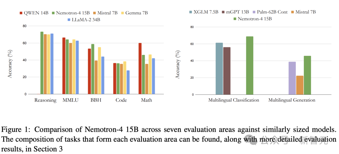在7个评估基准上,与同等参数规模的模型相比,Nemotron-4 15B表现出色。