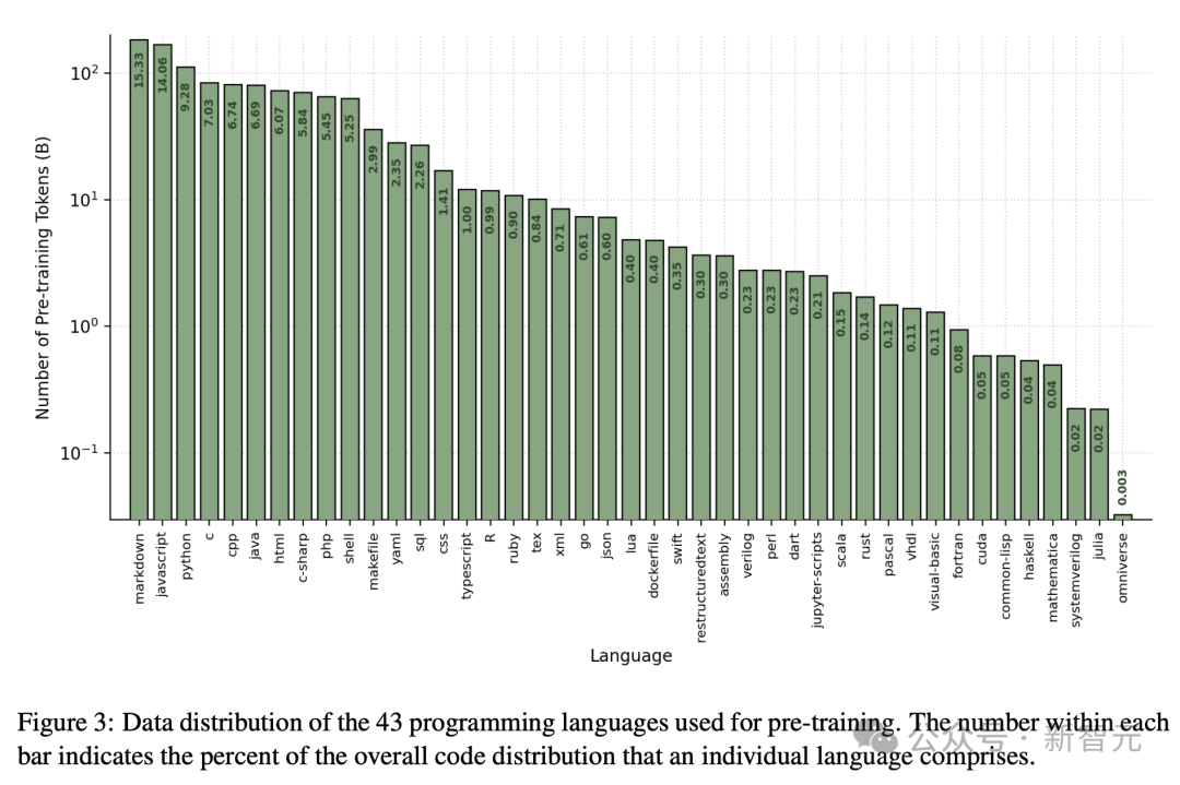 此外,研究人员分别在图3和图4中共享预训练数据集中用于代码和多语言标记的分布。