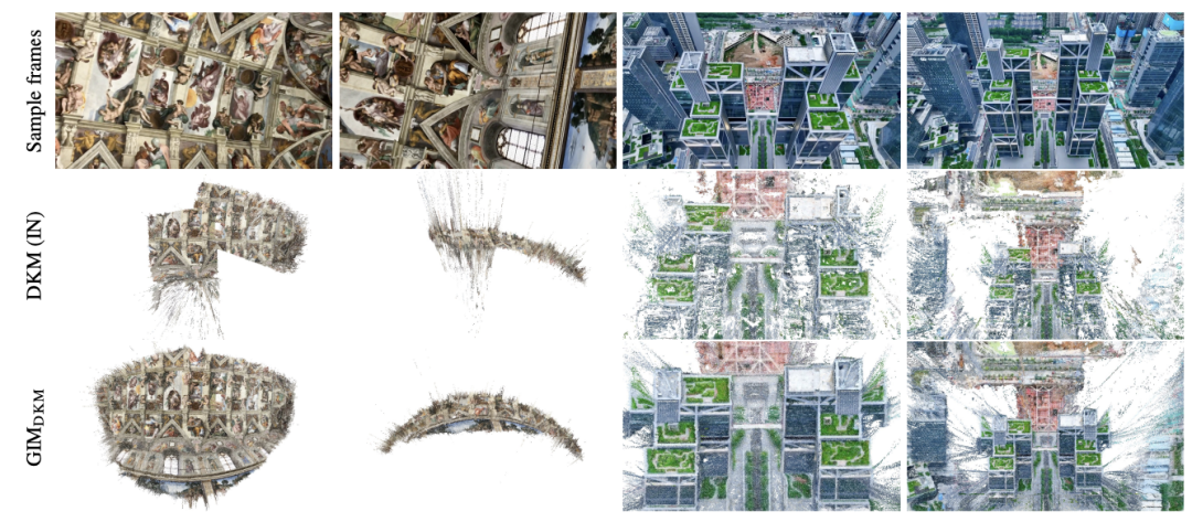 由于 GIM 能够有效提升 COLMAP 多视角重建的质量,因此,GIM 也能为对应的下游任务中「增光添彩」,下面几张图展示了用 GIM 的 COLMAP 结果来初始化 Gaussian Splatting 的效果。可以看到在一些有挑战性的场景中,基于 SIFT 和 DKM 的 COLMAP 都不能够很好地提供有效的 initialization,导致渲染效果不佳。