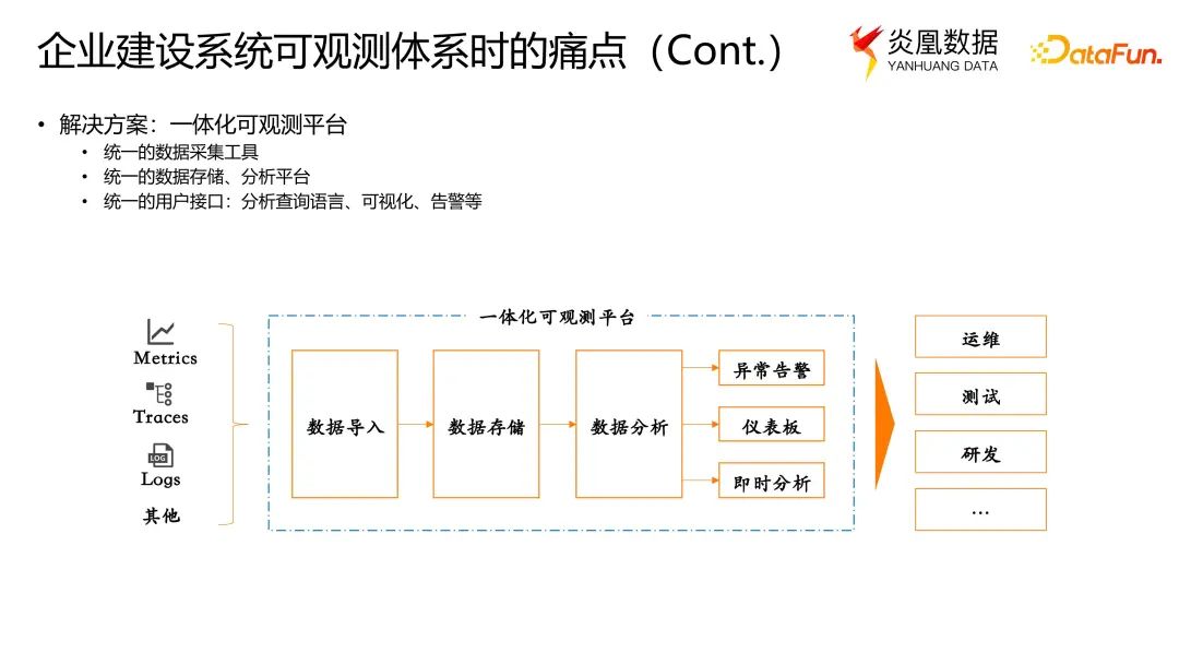可观测性是近年来的热门话题之一。一个具备良好可观测性的系统可以提高企业的生产效率,提高产品的质量、用户满意度等。尤其是随着容器云原生微服务架构技术的广泛应用,系统组件越来越多,处理请求的链路越来越长,故障排查也面临着更高难度的挑战,这也是很多企业存在的普遍痛点。本文将分享炎凰数据如何通过新的可观测化能力平台来帮助企业对IT系统或者业务系统进行监控,对性能进行可视化监测。