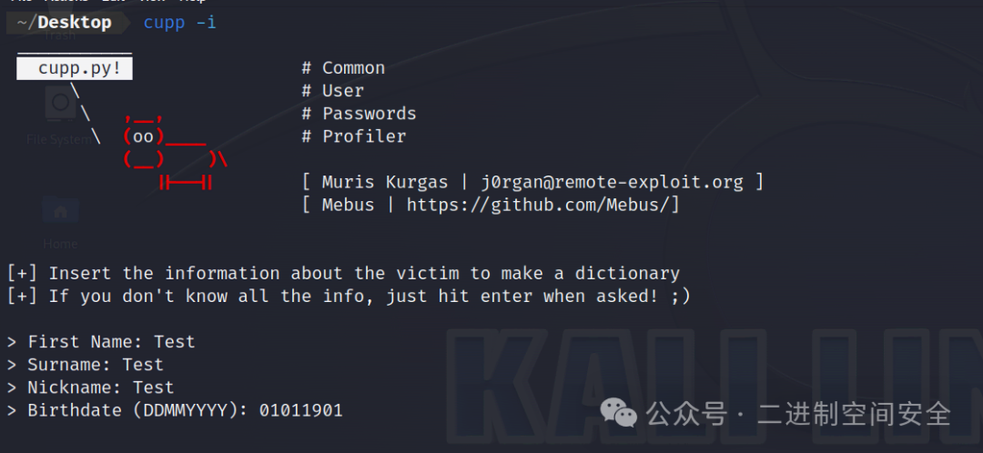 除此之外, 还可以利用CUPP(Common User Passwords Profiler)工具,根据个人信息生成定向的单词列表, 可以利用的信息包括:姓名、宠物的名字、生日等, 最终创建一个可用于字典攻击的定制单词列表, 该工具使用过程如下:
