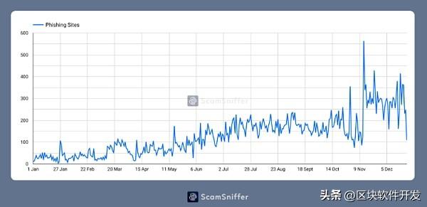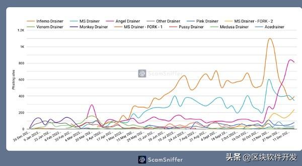 通过分析钓鱼网站的数量趋势可以看出,钓鱼活动每个月都在逐渐增加。这与钱包盗贼(Wallet Drainers)服务的盈利和稳定密切相关。