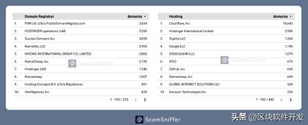 以上是这些钓鱼网站使用的主要域名注册商。通过分析服务器地址还可以发现,他们中的大多数都利用Cloudflare等服务来隐藏其真实的服务器地址。