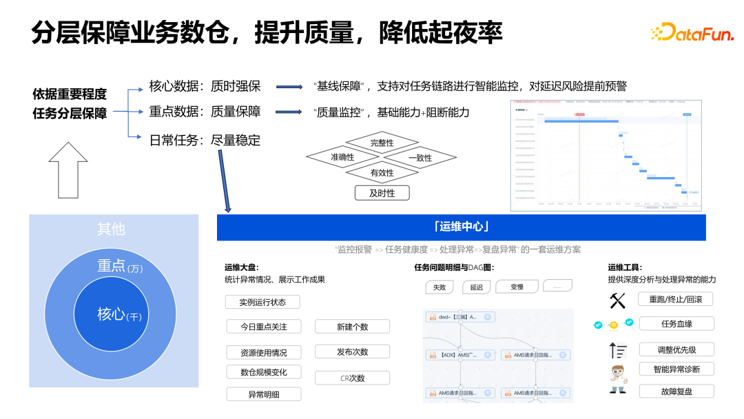 解法4:从上游提前规避数据质量问题。在上游开发阶段充分进行数据测试,核心节点出现问题时能阻断下游传播,防止对下游数据的污染。对于报表延迟风险,在上游出现变慢或失败等突发状况时,评估下游的一些核心保障节点是否有延迟风险。