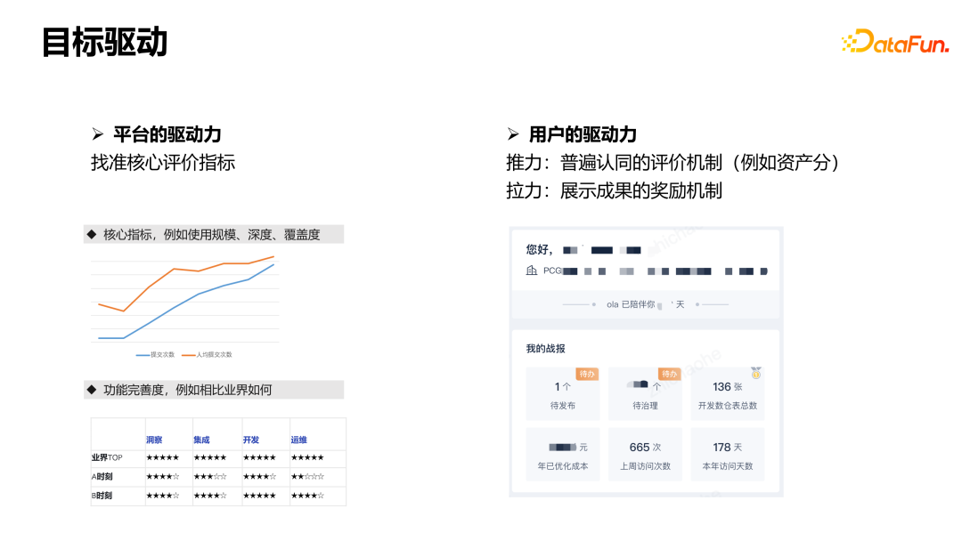 用户的驱动力:一为推力驱动,通过拉通各个业务团队共同制定一个评价机制,来评价整个资产化过程,形成平台分资产分评价体系。如果有规则没有达标,则会呈现为待治理状态。二为拉力驱动,把一些工作成果直观地统计出来,例如近 7 天开发了多少表、处理了多少任务异常情况等等,对用户进行激励。