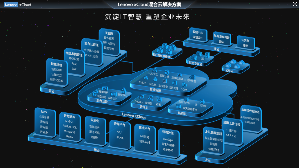 联想混合云是联想沉淀了20多 年 IT 智慧,基于端到端最佳实践,融合敏捷的云原生技术、统一的多云管理平台、卓越的智能运维、高可用的私有云、高效的数据库管理平台,打造的业界领先的“建-上-用-管”云上全生命周期解决方案,依托端边云网智“新IT”架构的优势,以及自身转型实践经验,通过提供高质量的产品、方案与服务,已经帮助制造、能源、教育、医疗、零售、金融等众多行业客户加快数字化、智能化转型。