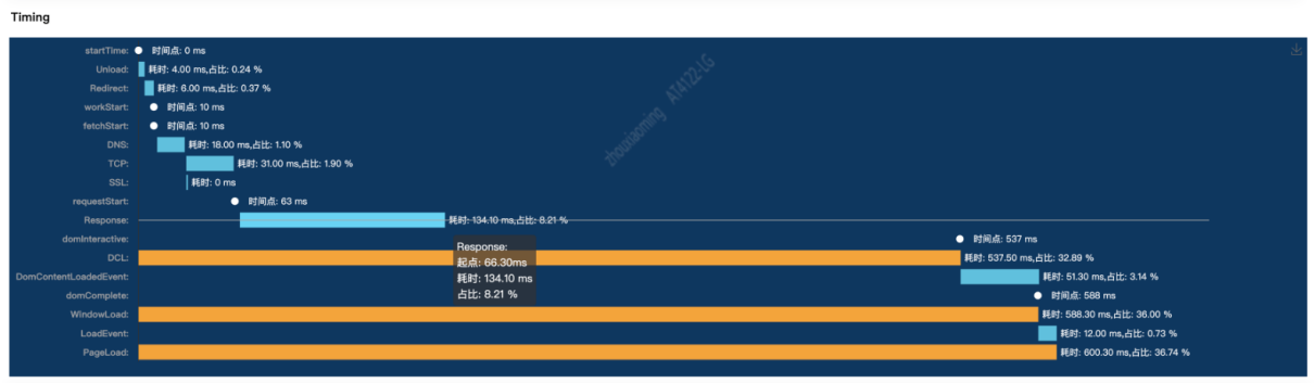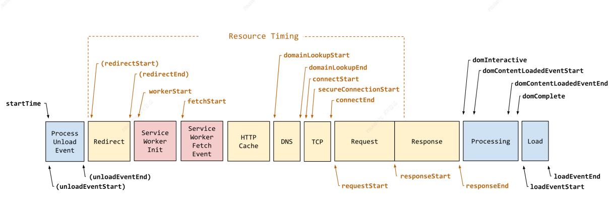 PerformanceNavigationTiming ( 以下简称 Timing ): 基于 W3C 规范,着重从浏览器处理过程角度衡量页面性能,以下简称 Timing。