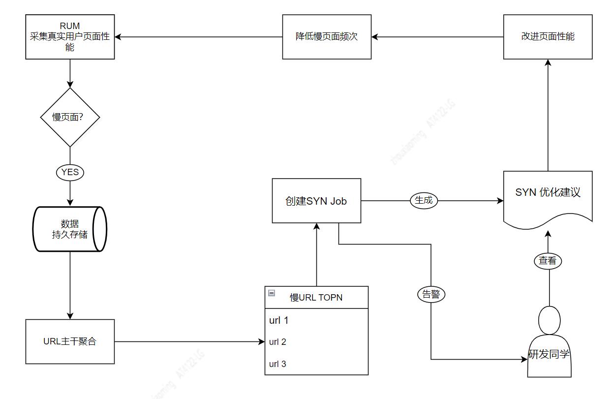 前文深入分析了 SYN 和 RUM 各自特点、使用方法及优缺点等,我们发现 SYN 和 RUM 各有所长、无法替代,最好同时引用 SYN 和 RUM,构建体系化性能监控架构,提供性能监控和性能分析工具链,支持产研同学在 devpos 各阶段中发现和定位页面性能问题。