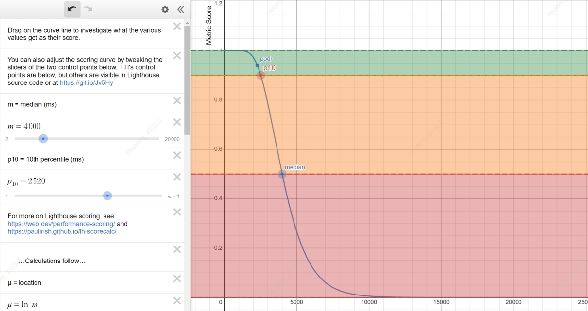m 表示中位数,图中 m 值为 4000ms,表示当 LCP 值为 4000ms 时,得 50 分;同理 p10 为 2520ms,LCP 值为 2529ms 时,得 90 分。设置 m 和 p10 后,会生成右边的评分曲线模型,根据该模型可以获得 LCP 值从 0 到正无穷时的得分。