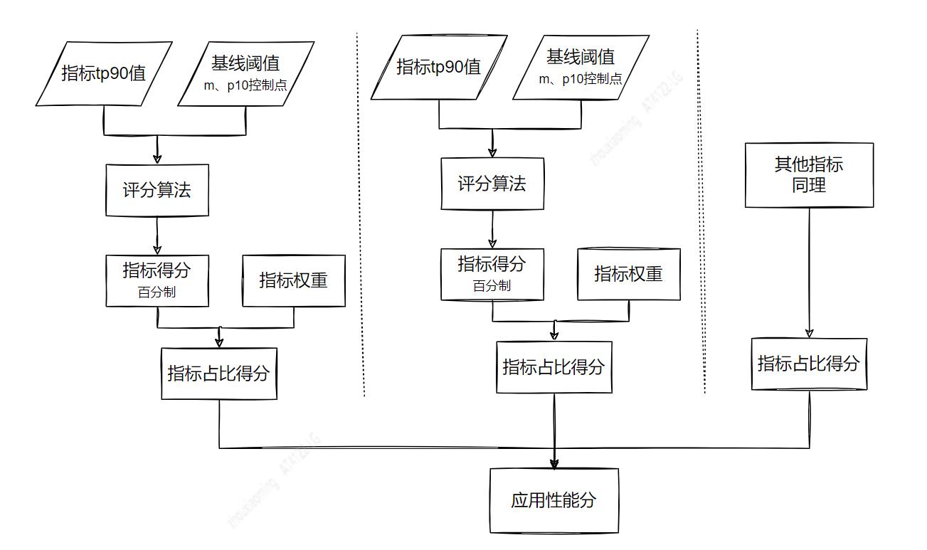 获取应用性能分过程中涉及几个重要流程:1) 指标筛选及权重设置;2) 选择评分算法;3) 确立指标基线;4) 使用加权平均算法计算应用性能分。下面逐一介绍。