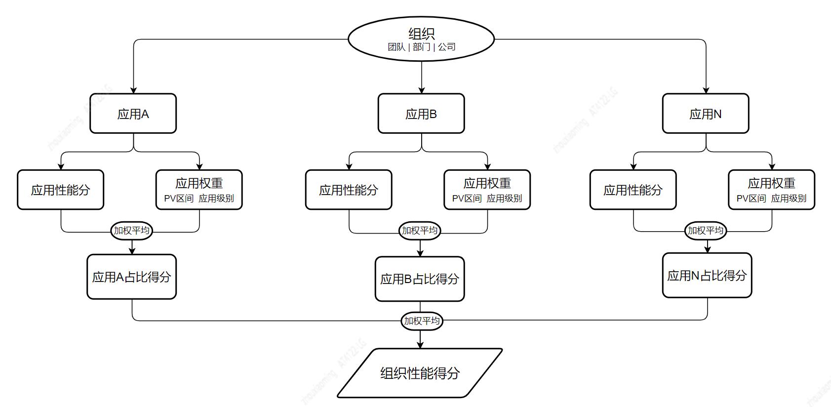 至于求各级组织,含团队、部门及公司的性能分,则根据其管辖的应用个数、应用性能分及应用权重,仍使用加权平均算法获取组织分。流程如下: