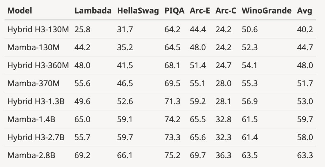作者下载了大小为 125M-2.7B 参数的预训练 H3 模型,并进行了一系列评估。Mamba 在所有语言评估中都明显更胜一筹,值得注意的是,这些 H3 模型是使用二次注意力的混合模型,而作者仅使用线性时间 Mamba 层的纯模型在各项指标上都明显更优。