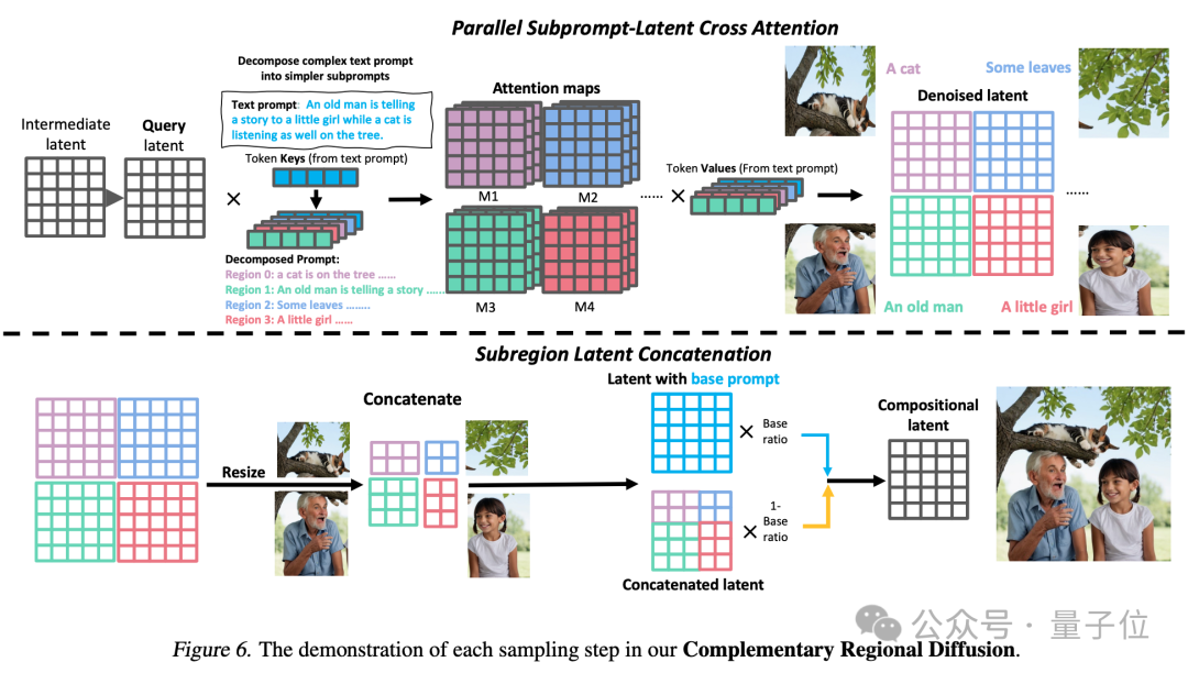 3、互补区域扩散(Complementary Regional Diffusion):将空间划分好后,非重叠的区域各自根据子提示生成图像,然后进行拼接。
