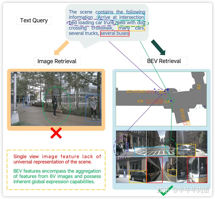 在现有的二维图像检索方法下,可能会出现一些场景检索的问题,比如缺乏全局特征表示和次优的文本检索能力。为了解决这些问题,本文作者提出了BEV-CLIP,这是第一个利用描述性文本作为输入以检索相应场景的多模态BEV检索方法。这种方法应用了大型语言模型(LLM)的语义特征提取能力,以便进行广泛的文本描述的零次检索,并结合了知识图的半结构信息,以提高语言嵌入的语义丰富性和多样性。
